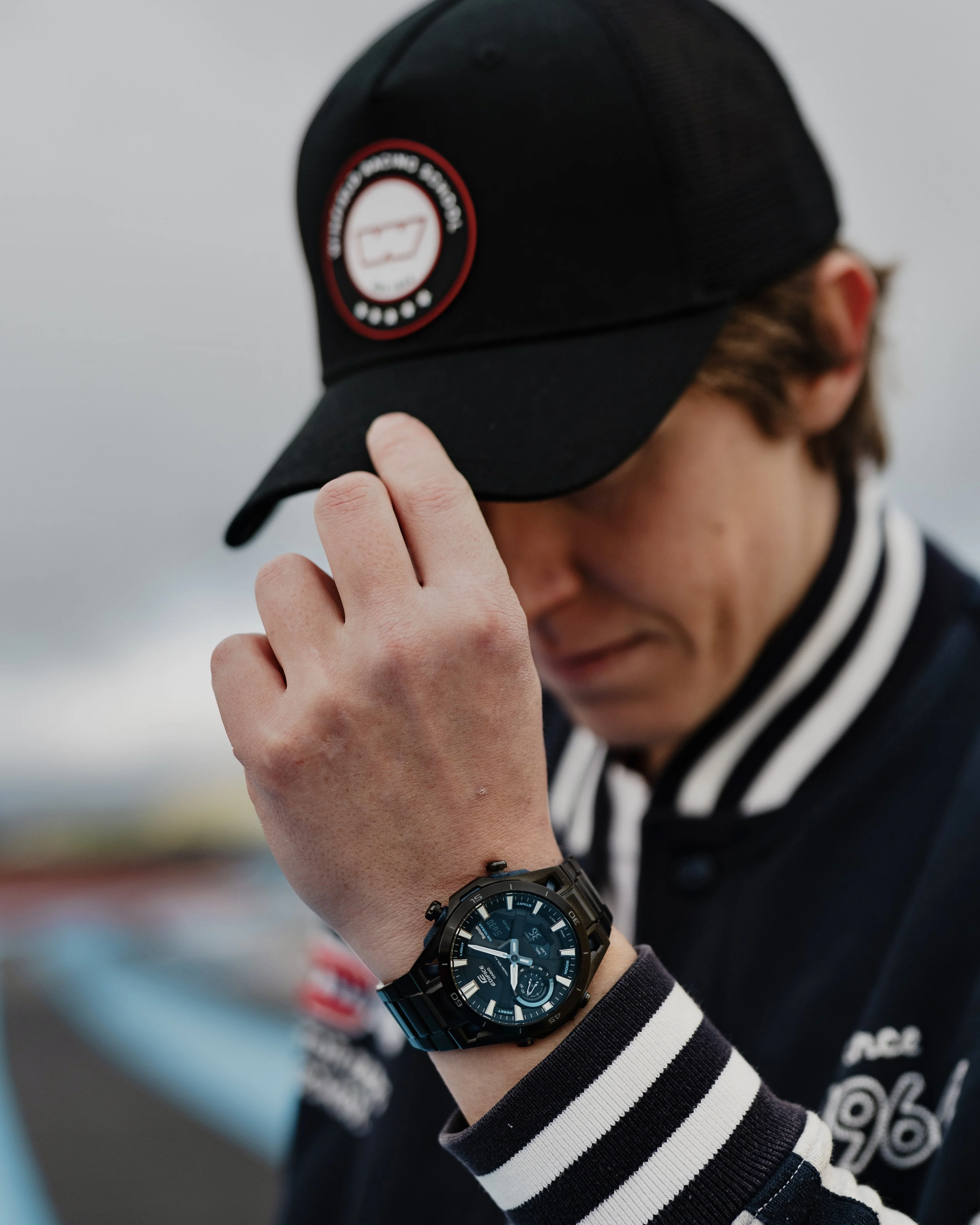 Its arm-shaped lugs evoke the double wishbone suspension of Formula racing cars, while the three-dimensional protrusions recall the push rods of a race car. Add to this the depth of the dimensional dial, and you have a timepiece imbued with a dynamic presence all its own. The case combines carbon fibre-reinforced resin and stainless steel for lightness and high rigidity like a racing machine. At 2 mm less in diameter than the previous ECB-2000 SOSPENSIONE, this compact design delivers everyday easy comfort and a more stylish fit.