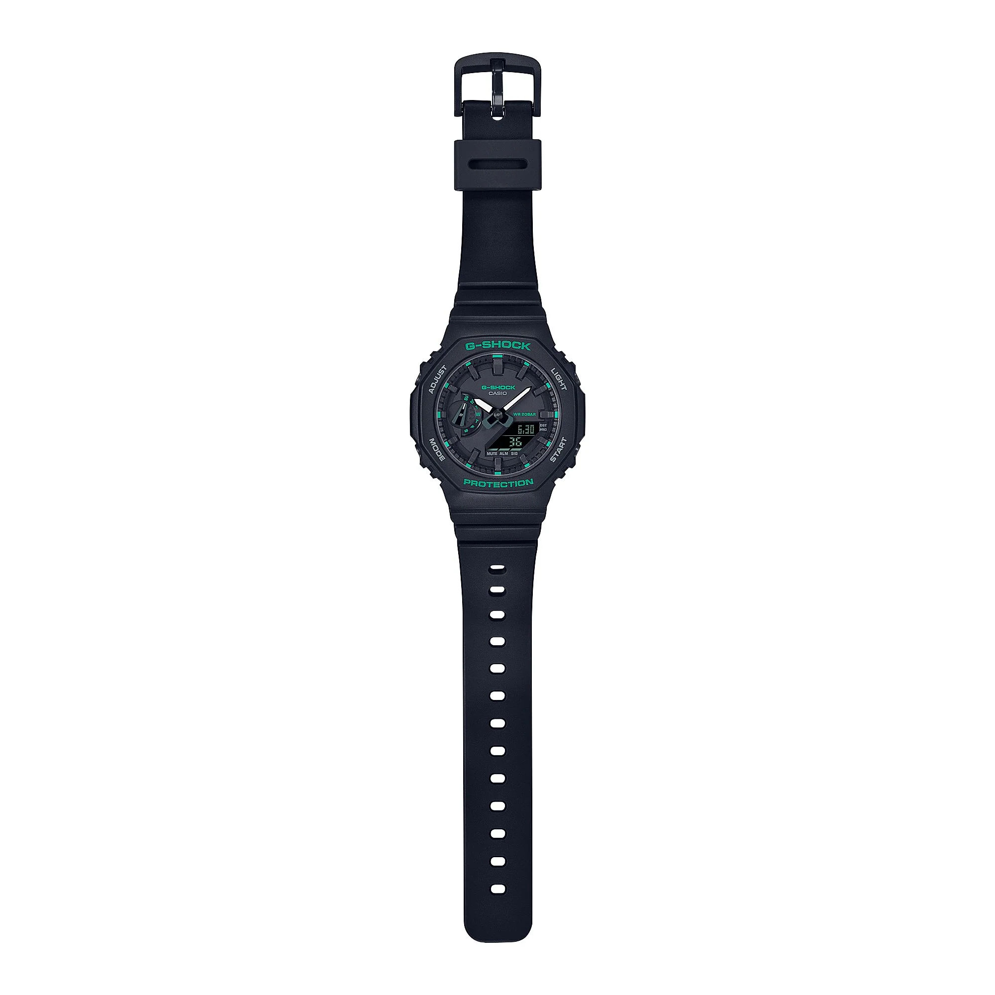 Go stylish and comfortable with the slimmer, more compact analogue-digital GMA-S2100 featuring modern green accents. The flat face and simple bar index marks come together in a streamlined, satisfying design. An original spin in on-trend green for details like the logo, index mark, and LCD makes this watch a perfect street fashion accessory.